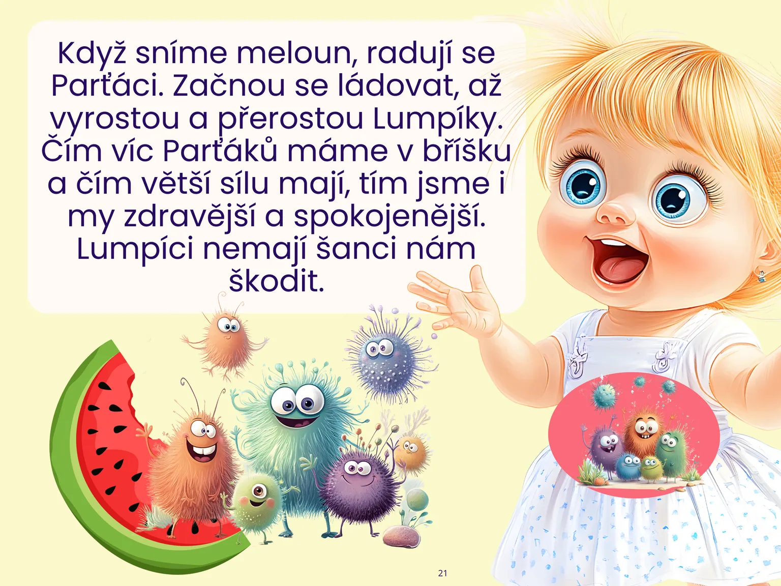 Na 30 stránkách s veselými obrázky děti poznají hodné a zlé bakterie a zjistí, co se děje v těle po sladkostech.